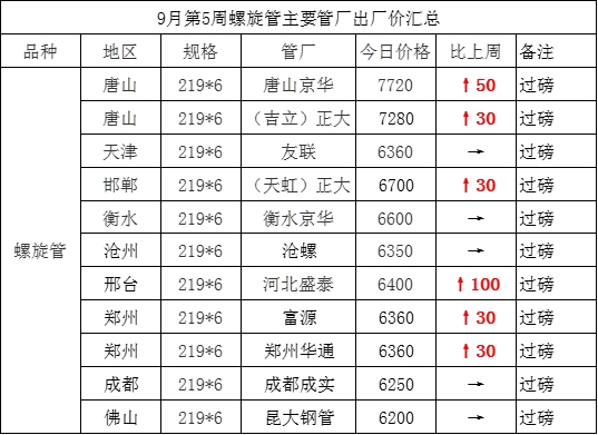 • 9月第5周螺旋管主要管厂出厂价汇总