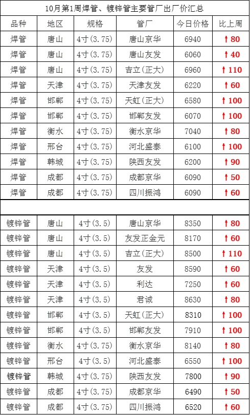 • 10月第1周焊管、镀锌管主要管厂出厂挂牌价汇总