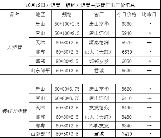 • 10月12日方矩管主要管厂出厂挂牌价汇总