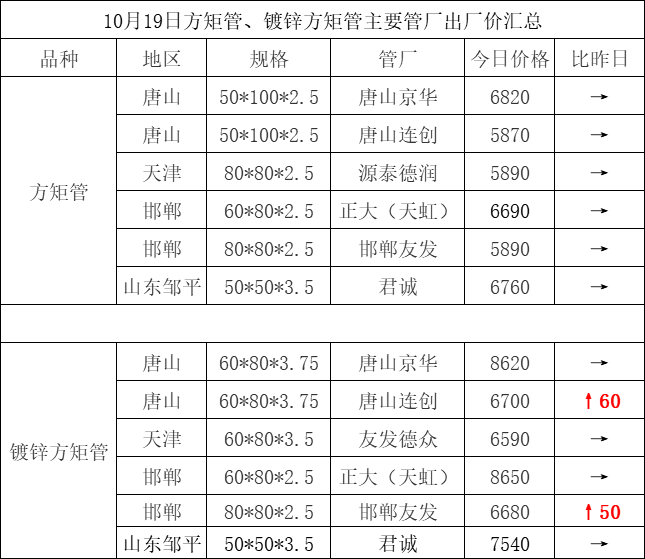 • 10月19日方矩管、镀锌方矩管主要管厂出厂价汇总