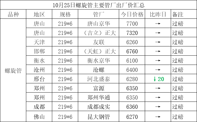 • 10月25日螺旋管主要管厂出厂价汇总