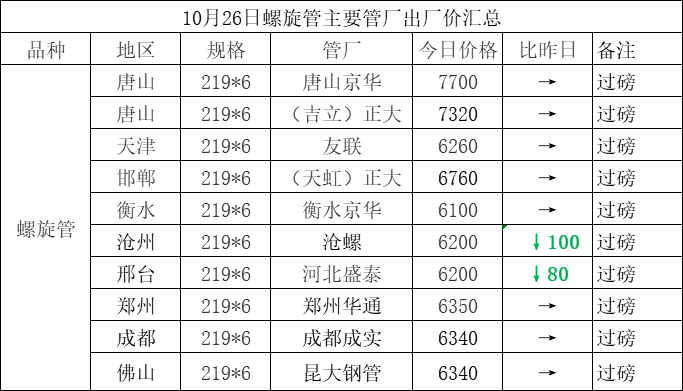 • 10月26日螺旋管主要管厂出厂价汇总