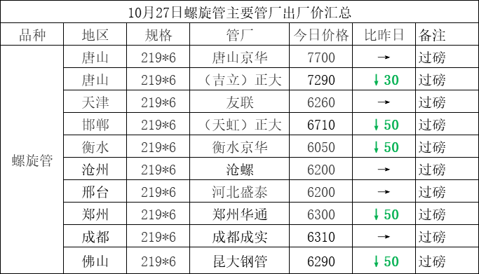 • 10月第3周螺旋管主要管厂出厂价汇总