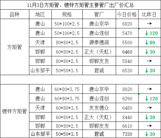 11月3日方矩管、镀锌方矩管主要管厂出厂价汇总