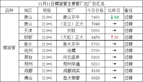 • 11月第1周螺旋管主要管厂出厂价汇总
