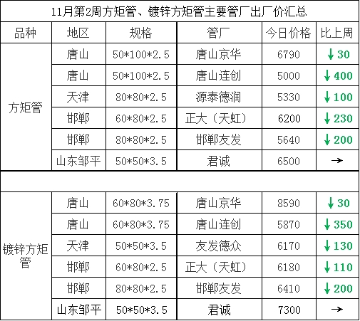 • 11月第2周方矩管主要管厂出厂挂牌价汇总