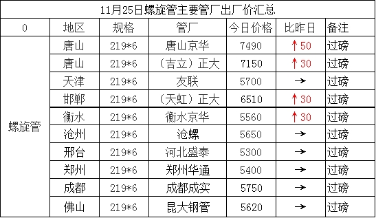 11月25日螺旋管主要管厂出厂价汇总