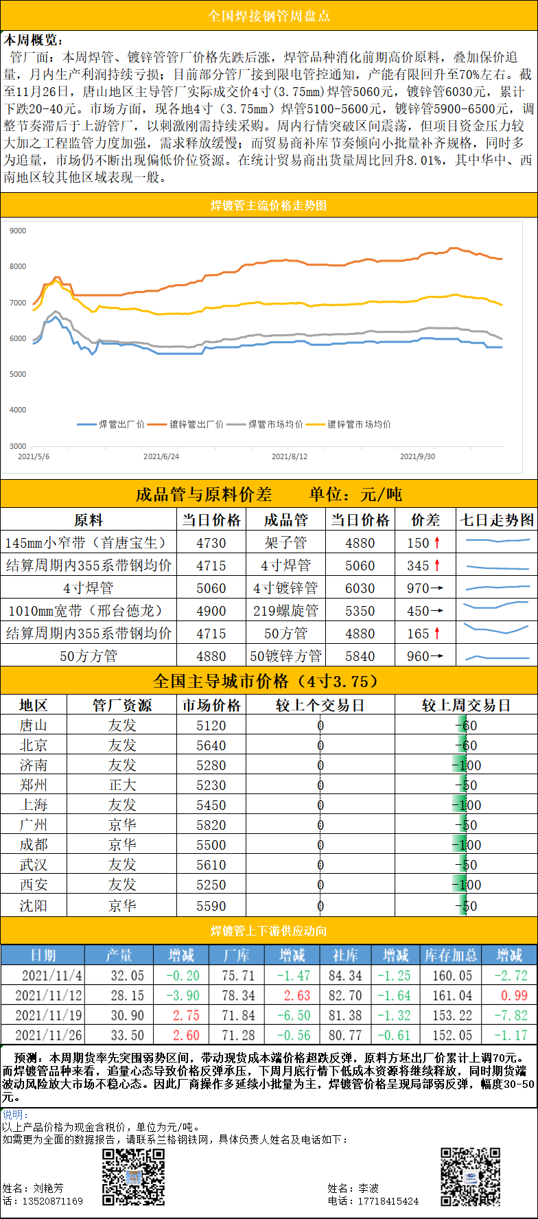 - 11月第4周焊管、镀锌管主要管厂出厂挂牌价汇总2021/11/26