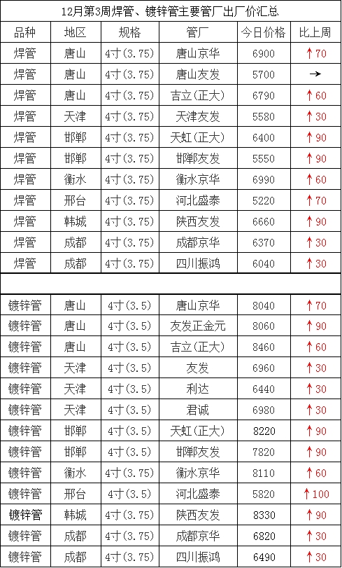 • 12月第3周焊管、镀锌管主要管厂出厂挂牌价汇总