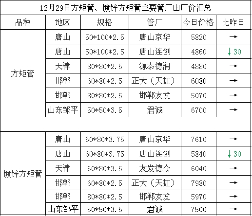 12月29日方矩管、镀锌方矩管主要管厂出厂价汇总