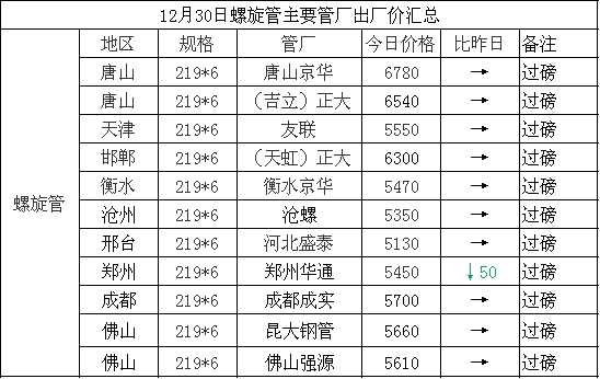 12月30日螺旋管主要管厂出厂价汇总