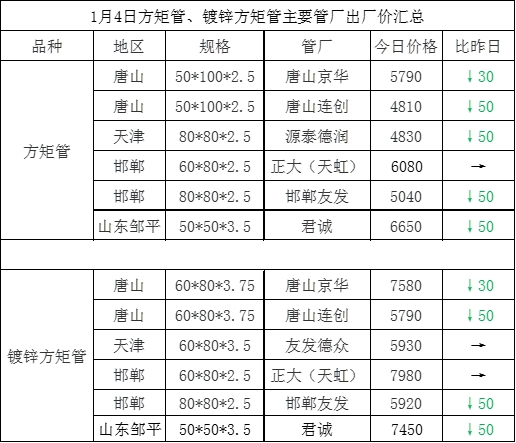 • 1月4日方矩管主要管厂出厂挂牌价汇总
