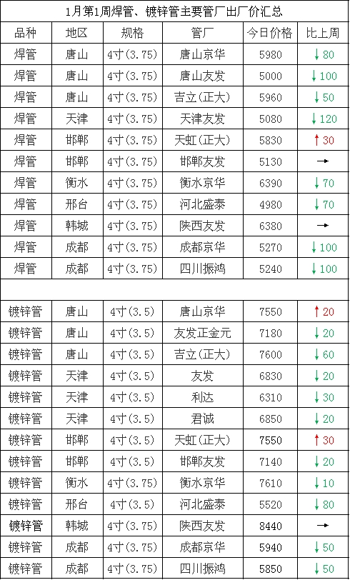 1月第1周焊管、镀锌管主要管厂出厂价汇总