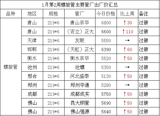 1月第1周螺旋管主要管厂出厂价汇总