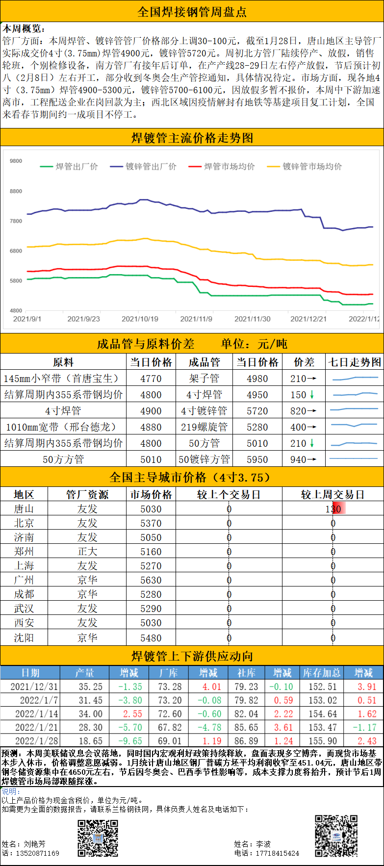 - 节后焊管供应预期偏弱或继续支撑行情价格走势2022/1/28