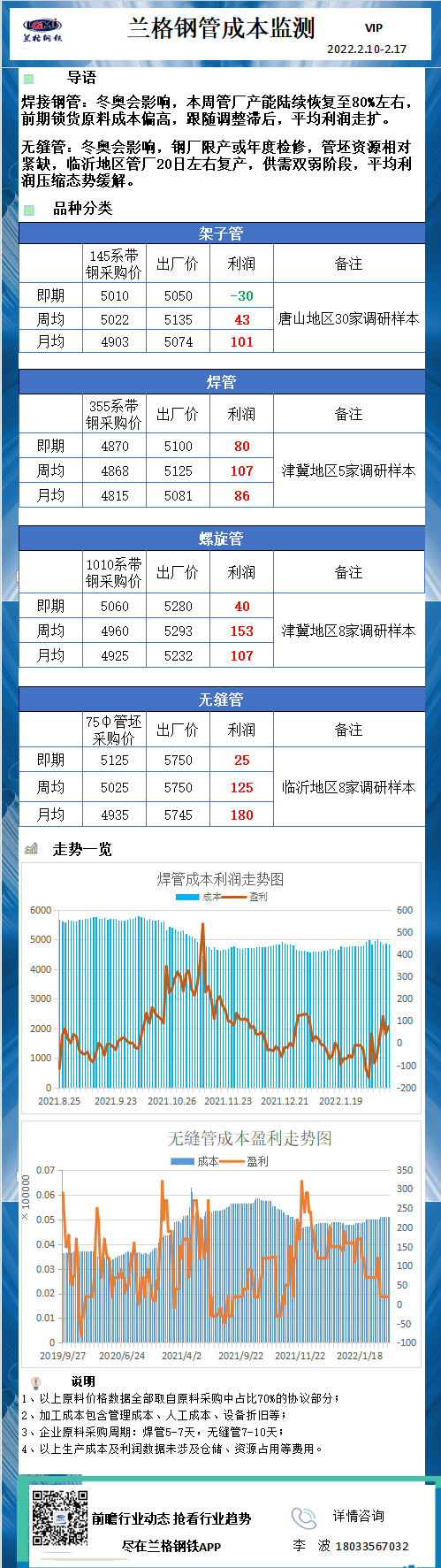 兰格调研:逐步复产阶段 管价调整滞后 利润空间均有走扩(2月17日)