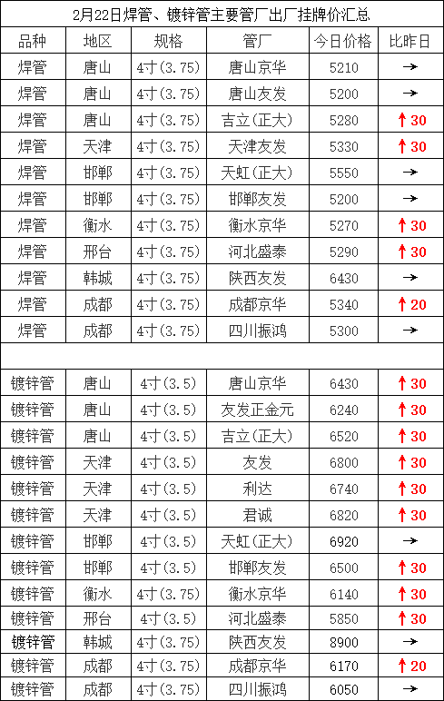 2月22日天津友发钢管集团股份有限公司第一分公司出厂价上调30
