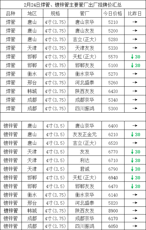 2月24日焊管、镀锌管主要管厂出厂挂牌价汇总