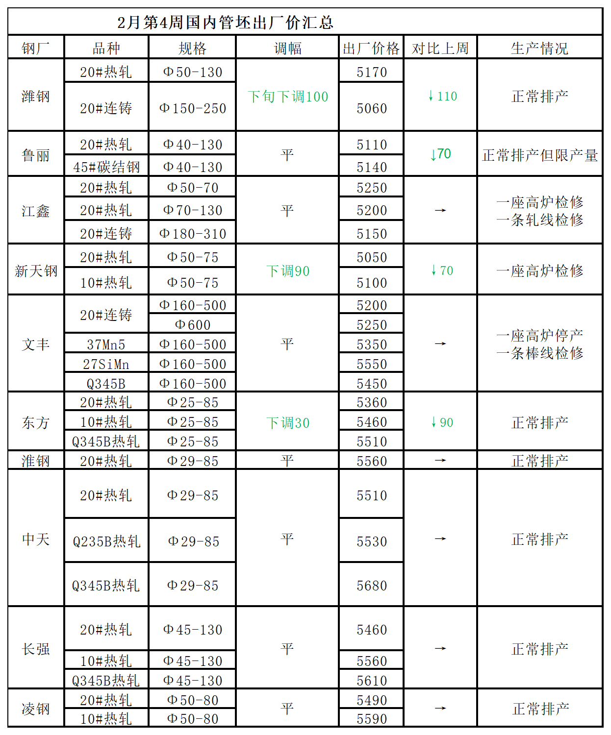 2月第4周国内管坯出厂价汇总