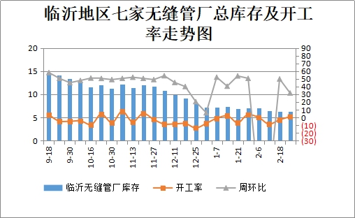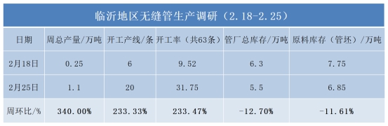 截至2月25日,临沂地区63条生产线(含1条连轧机组)开工率31.75%,较上周增加22.23个百分点,周总产量1.1万吨,增加0.85万吨。临沂地区7家管厂总库存6.3万吨,较上周增加0.07万吨,周环比增加1.11%。聊城地区30条产线开工率73.3%,12家管厂总库存15.2万吨,较上周增加2.1万吨,周环比增加16%,原料库存24.3万吨,较上周增加6.1万吨,周环比33.5%。