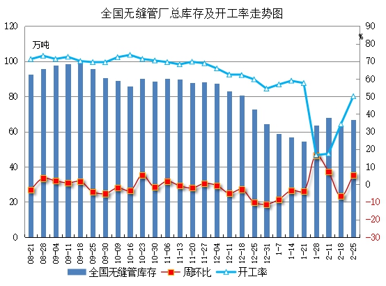 据兰格钢铁对样本企业调研无缝管生产情况,截至2月25日:全国200条(含长流程钢管厂40条)生产线开工率50.1%,环比增长10.9个百分点。总库存66.7万吨,较上周增加3.3万吨。随着冬奥会20号落下帷幕,临沂环保政策解除,管厂陆续开工,但管厂担心后期残奥会和两会仍会限制产量,当前各产线并未全部投产,另磐金六条连轧机组均正常生产。