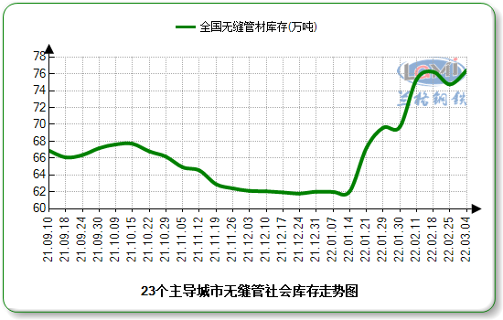 据兰格钢铁云商数据监测平台显示:国内23个主导城市无缝管社会库存总量76.42万吨,周环比上涨2.24%。