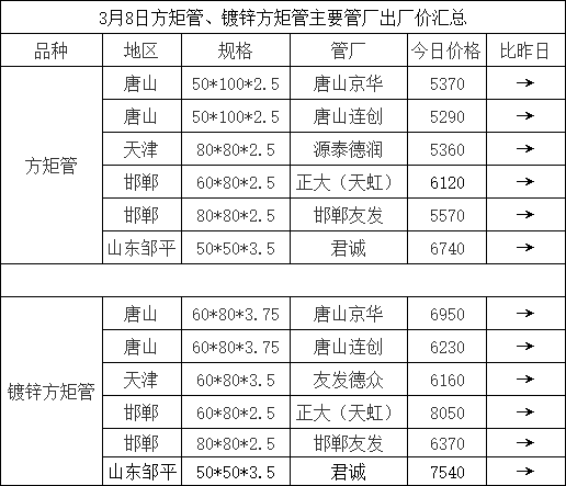 3月8日方矩管、镀锌方矩管主要管厂出厂价汇总