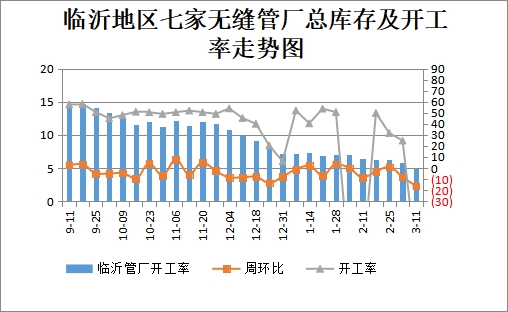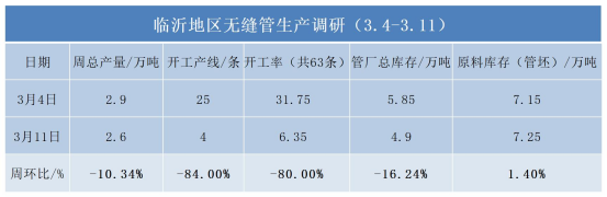 截至3月11日,临沂地区63条生产线(含1条连轧机组)开工率6.35%,较上周下降80个百分点,周总产量2.6万吨,减少0.3万吨。临沂地区7家管厂总库存4.9万吨,较上周减少0.95万吨,周环比减少16.24%。聊城地区30条产线开工率76.6%,12家管厂总库存15.8万吨,较上周增加0.6万吨,周环比增加3.79%,原料库存27.6万吨,较上周增加3.3万吨,周环比11.9%。