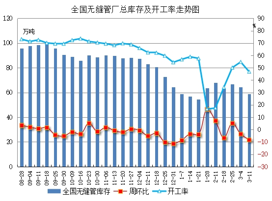 据兰格钢铁对样本企业调研无缝管生产情况,截至3月11日:全国200条(含长流程钢管厂40条)生产线开工率46.8%,环比下降7.9个百分点。总库存58.9万吨,较上周减少5.4万吨。受环保限产政策影响,本周临沂、河南等地管厂处于停产状态,运输车辆要求国六或新能源进厂,因此出货不佳,无缝管生产量大幅下降,本周五解除限产,预计下周恢复正常生产。