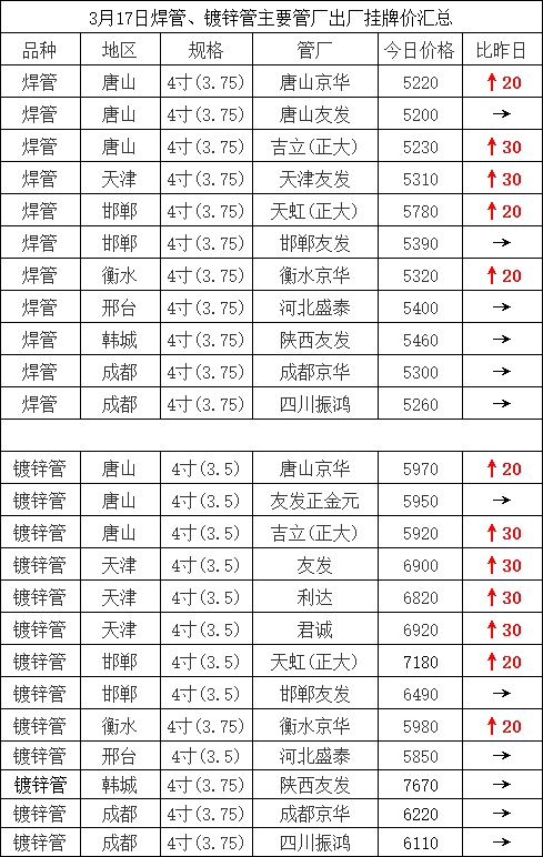 • 3月17日焊管、镀锌管主要管厂出厂挂牌价汇总