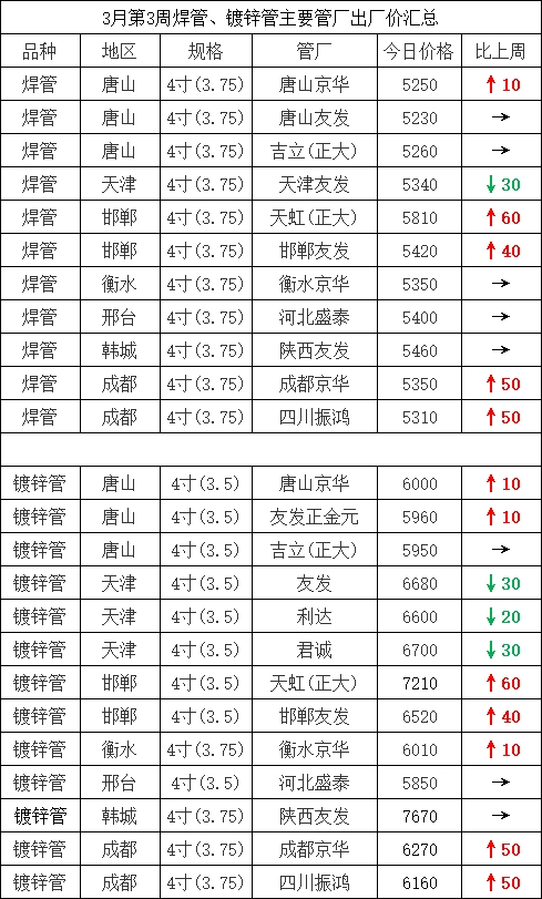 • 3月第3周主要焊管、镀锌管主要管厂出厂挂牌价汇总