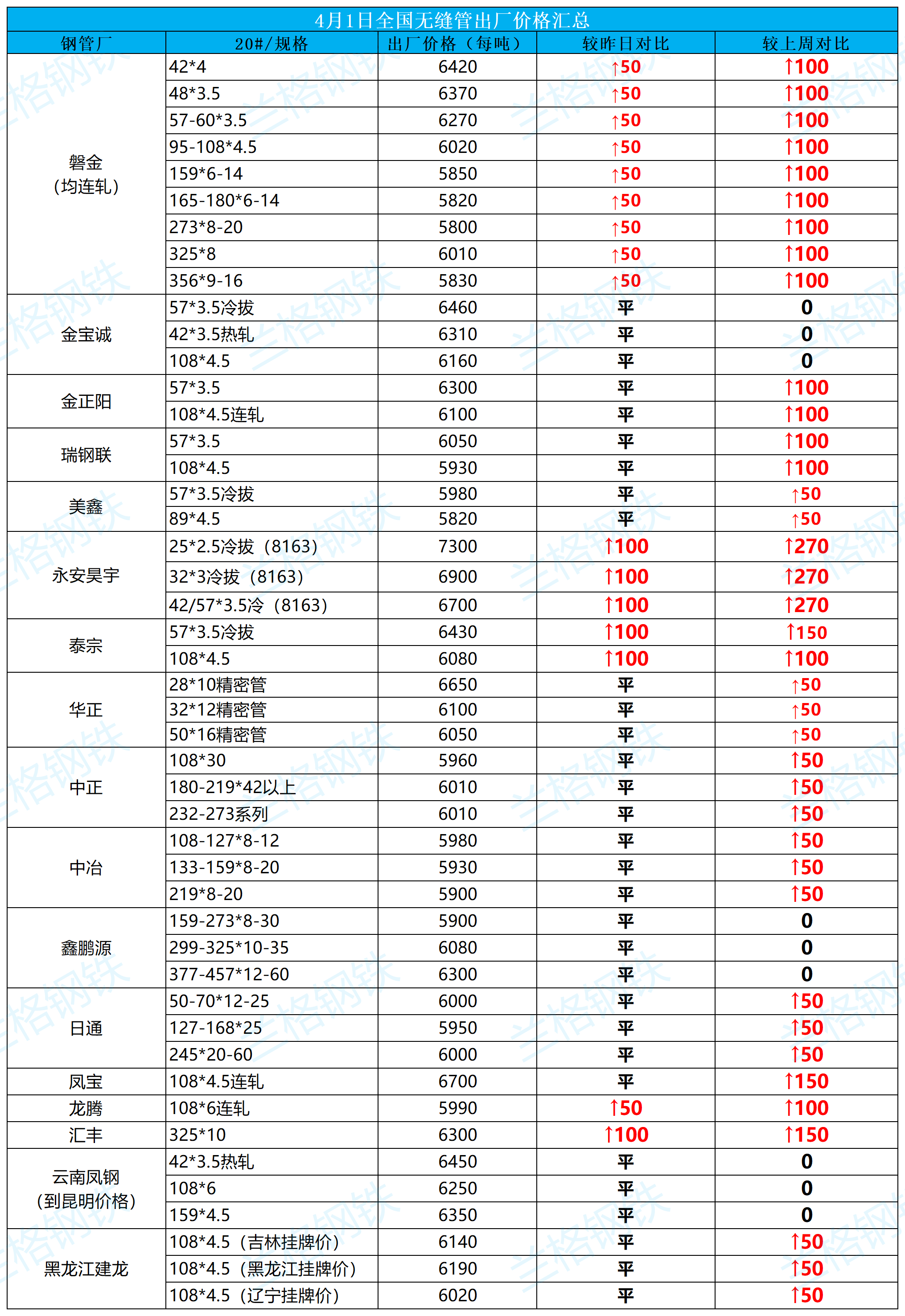 4月1日全国无缝管出厂价格汇总