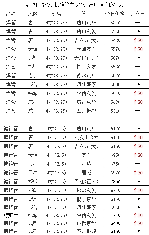 • 4月7日天津友发钢管集团股份有限公司第一分公司出厂价上调30