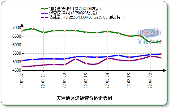 清明节至今,天津地区焊管、镀锌管价格涨至高位盘整,当地管厂出厂挂牌价累计上调90元(每吨,下同)。据兰格钢铁云商平台监测数据显示,天津市场焊管4寸*3.75mm主流报价5400-5450元,镀锌管4寸*3.75mm主流报价6000-6300元,与南方地区市场价格价差在200元左右。