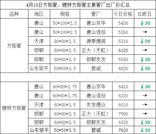 • 4月18日方矩管主要管厂出厂挂牌价汇总