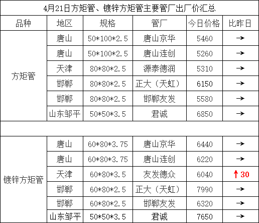 4月21日方矩管、镀锌方矩管主要管厂出厂价汇总