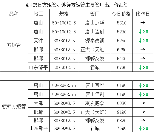 4月25日方矩管、镀锌方矩管主要管厂出厂价汇总