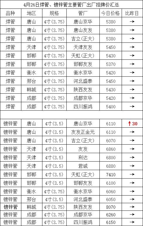4月26日焊管、镀锌管主要管厂出厂挂牌价汇总