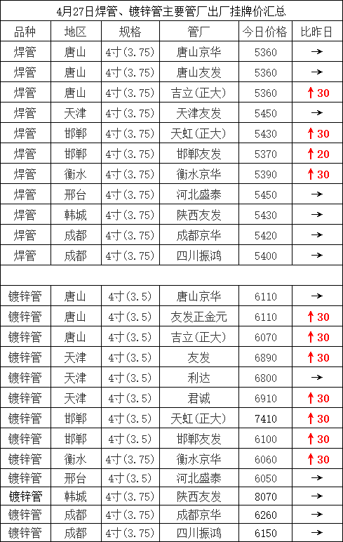 4月27日焊管、镀锌管主要管厂出厂挂牌价汇总