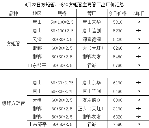 4月28日方矩管、镀锌方矩管主要管厂出厂价汇总