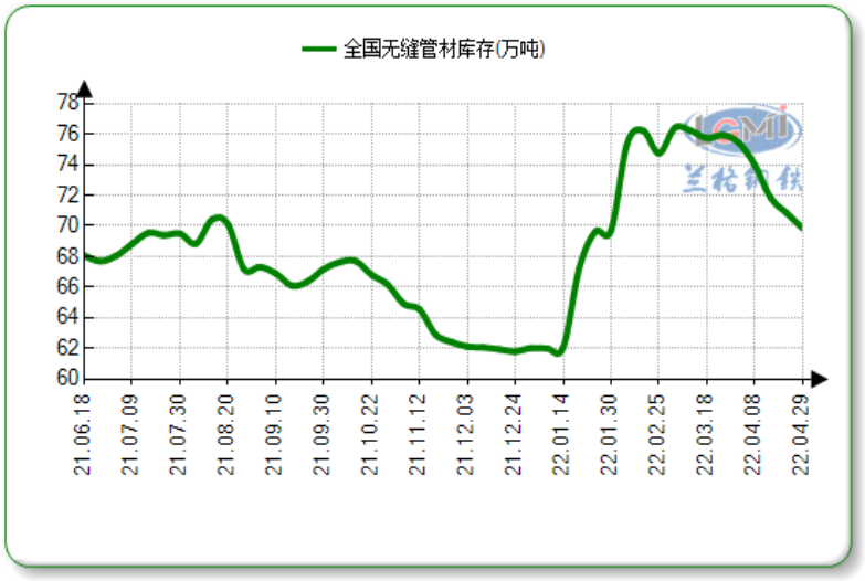 据兰格钢铁云商数据平台监测显示:截至4月29日国内23个城市无缝管社会库存总量69.84万吨,周环比下降1.42%。