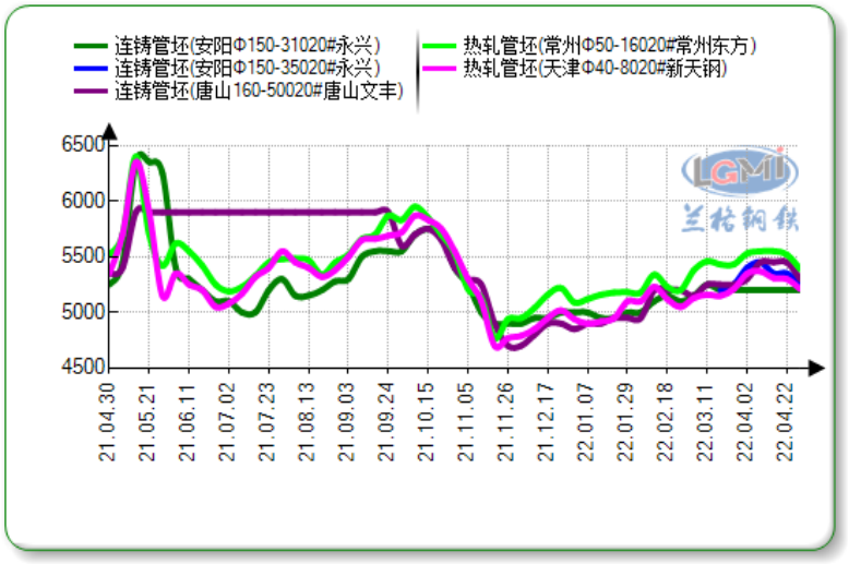 本周(4.25-4.29)国内无缝管市场价格稳中小降。上游管坯价格累计下调70-150元,现20#热轧管坯出厂报价5210-5660元(吨价,下同),20#连铸出厂报价5200-5300元。北方主流民营管厂出厂报价跌涨不一,其中河南汇丰、安阳龙腾和临沂金宝诚无缝管累计下调50元,磐金累计上调50元,黑龙江建龙累计上调50-100元,现中等连轧无缝管出厂价格6200-6260元,管厂即期亏损约75元。据兰格钢铁云商数据平台监测显示:截至4月29日国内十大主导城市108*4.5无缝管市场均价6471元,较上周下跌10元。