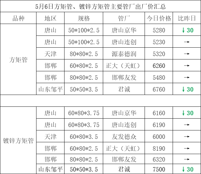 • 5月6日方矩管主要管厂出厂挂牌价汇总