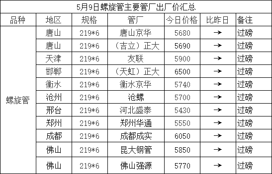 5月9日螺旋管主要管厂出厂价汇总