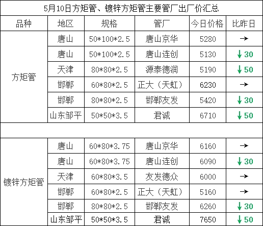 5月10日方矩管主要管厂出厂挂牌价汇总