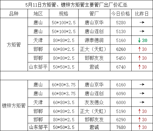 • 5月11日方矩管主要管厂出厂挂牌价汇总