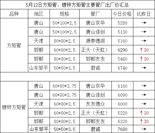 • 5月12日方矩管主要管厂出厂挂牌价汇总