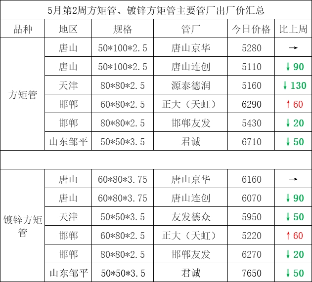 5月第2周方矩管主要管厂出厂挂牌价汇总