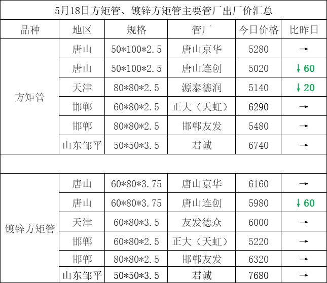 • 5月18日方矩管主要管厂出厂挂牌价汇总
