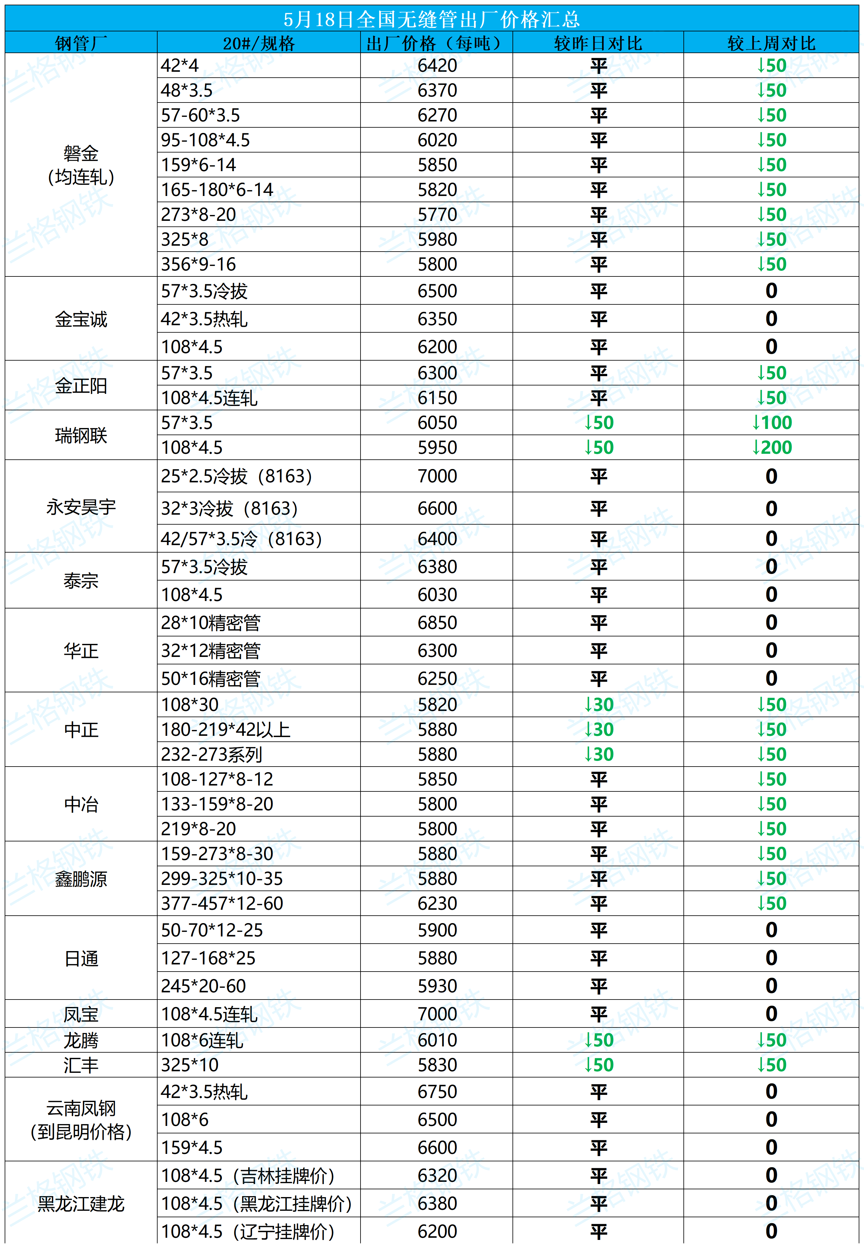 5月18日全国无缝管出厂价格汇总